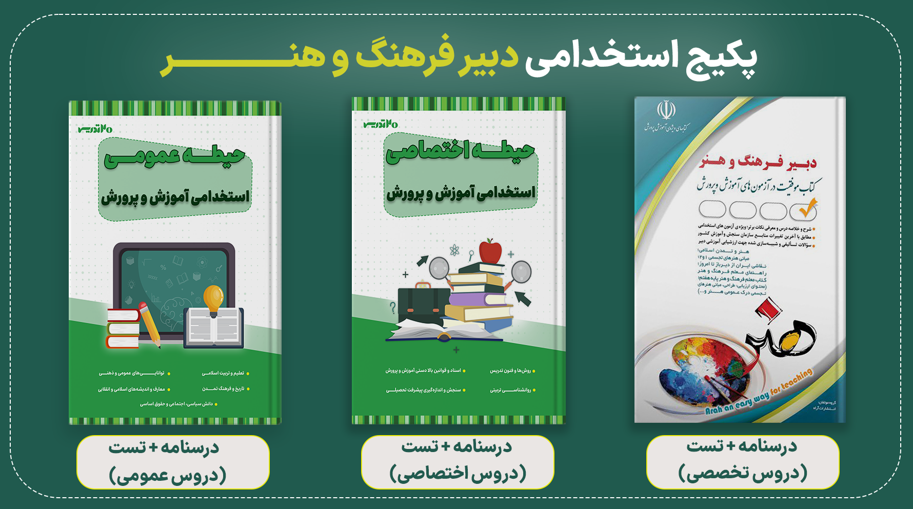 پکیج استخدامی دبیری هنر شامل سه کتاب است که یکی از بهترین و با کیفیت ترین کتاب های استخدامی است.