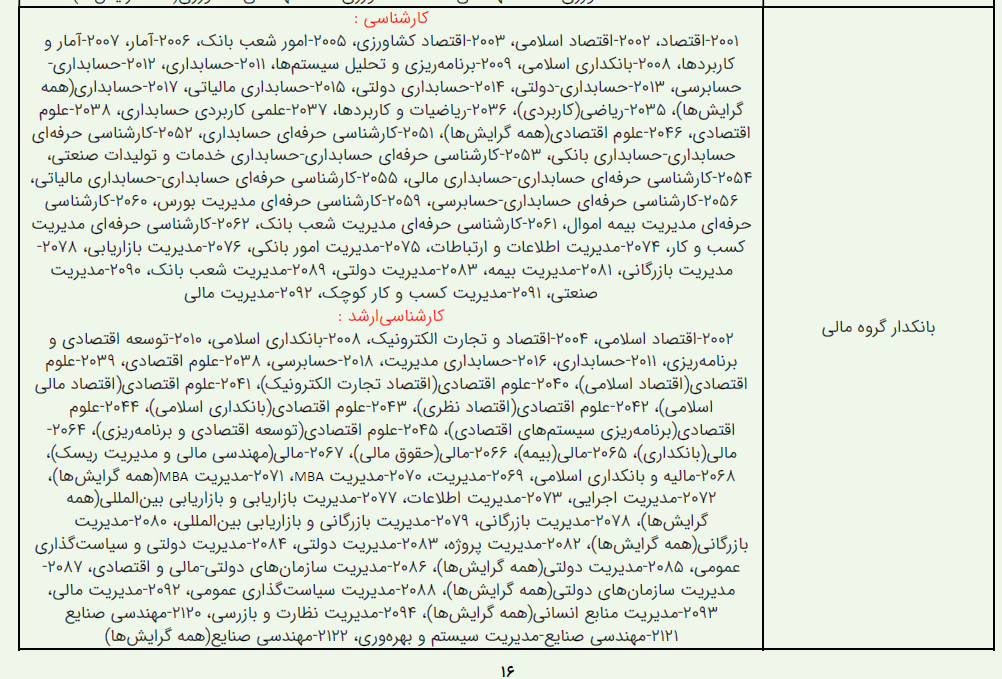 در لیست زیر می توانید رشته های قایل پذیرش شغل بانکدار مالی آزمون استخدامی بانک کشاورزی را مشاهده کنید که می توان گفت رشته های مثل مدیریت ، اقتصاد ، حسابداری و مهندسی صنایع در تمامی گرایش ها در این آزمون شرایط شرکت را دارند